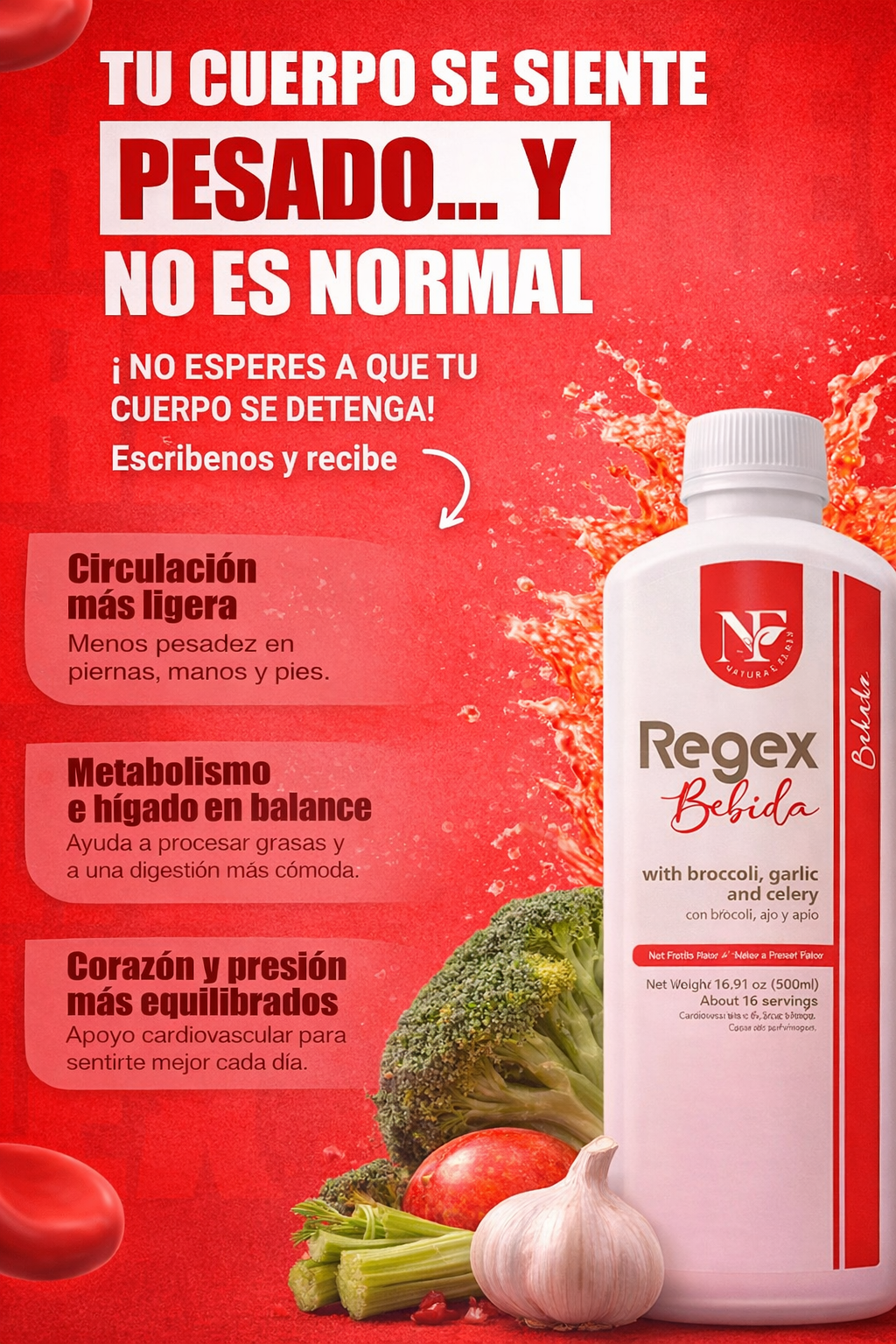 REGEX es un suplemento natural diseñado para apoyar la salud cardiovascular, la circulación sanguínea y la función nerviosa, ayudando a mantener niveles saludables de colesterol, mejorar el flujo sanguíneo y proteger el sistema nervioso frente a daños asociados a la neuropatía diabética.